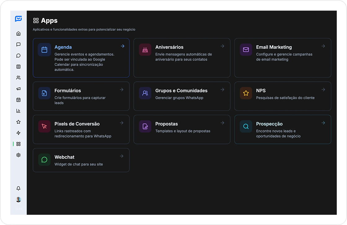 Gerencie agenda, aniversários, e-mail marketing, formulários, NPS, propostas comerciais e muito mais, tudo integrado em um único ecossistema, pronto para escalar a receita do seu negócio.